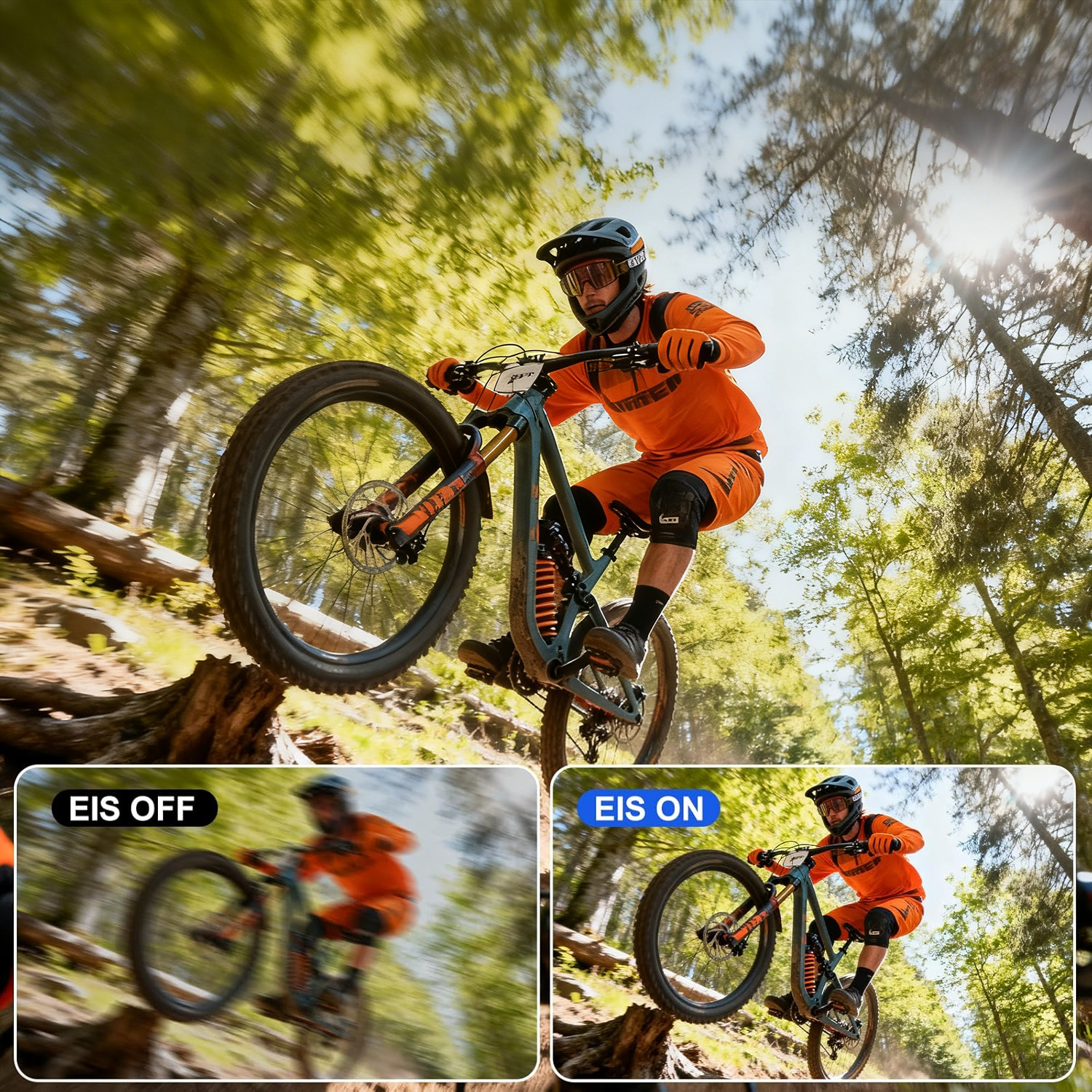 Orivana is equipped with advanced 6-Axis Electronic Image Stabilization (EIS) technology, taking stability to a whole new level. It intelligently compensates for shakes and tilts in every direction, keeping your footage silky smooth even during intense activities like running, cycling, or off-roading.Give your extreme challenge videos the cinematic smoothness they deserve!