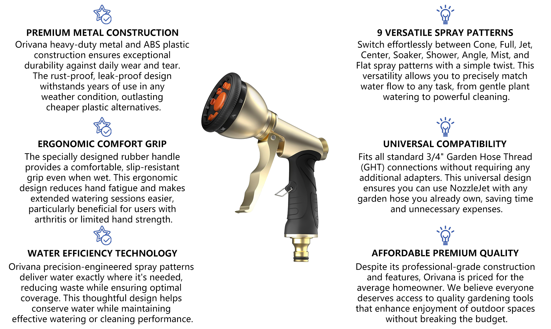 The Orivana's metal construction typically lasts 5-10 times longer than standard plastic nozzles, even with daily use in various weather conditions.