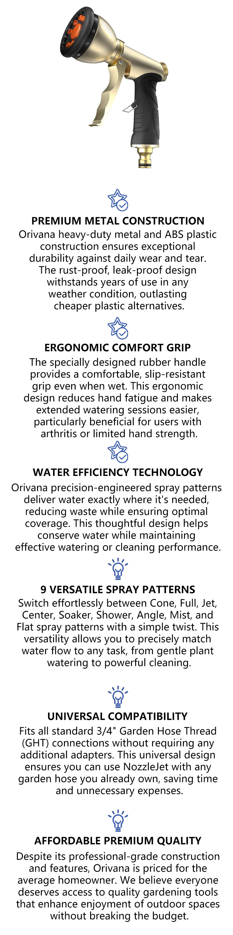 Orivana features heavy-duty metal construction with rust-proof and corrosion-resistant materials that withstand years of daily use in all weather conditions. The robust design eliminates leaks and breaks common in cheaper nozzles, saving you money and frustration while delivering consistent performance season after season.